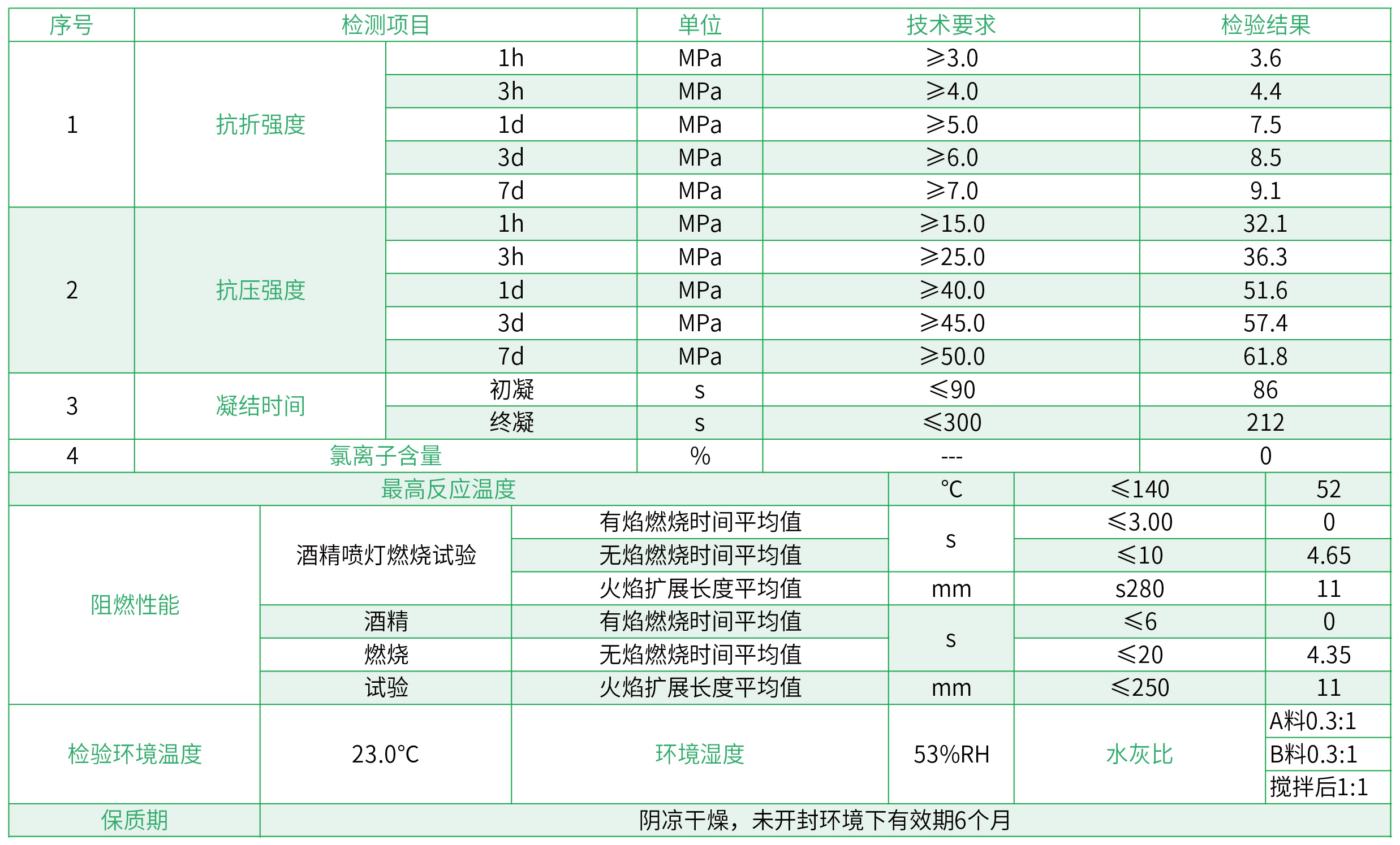 1.两种浆液在混合前,不凝固、不泌水、不沉淀;混合后凝固时间短、渗透性强、粘结力高、强度增长速度快;