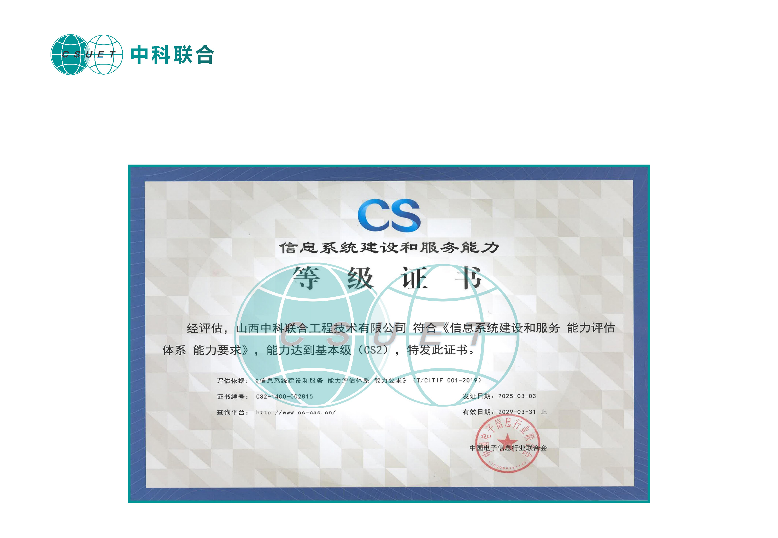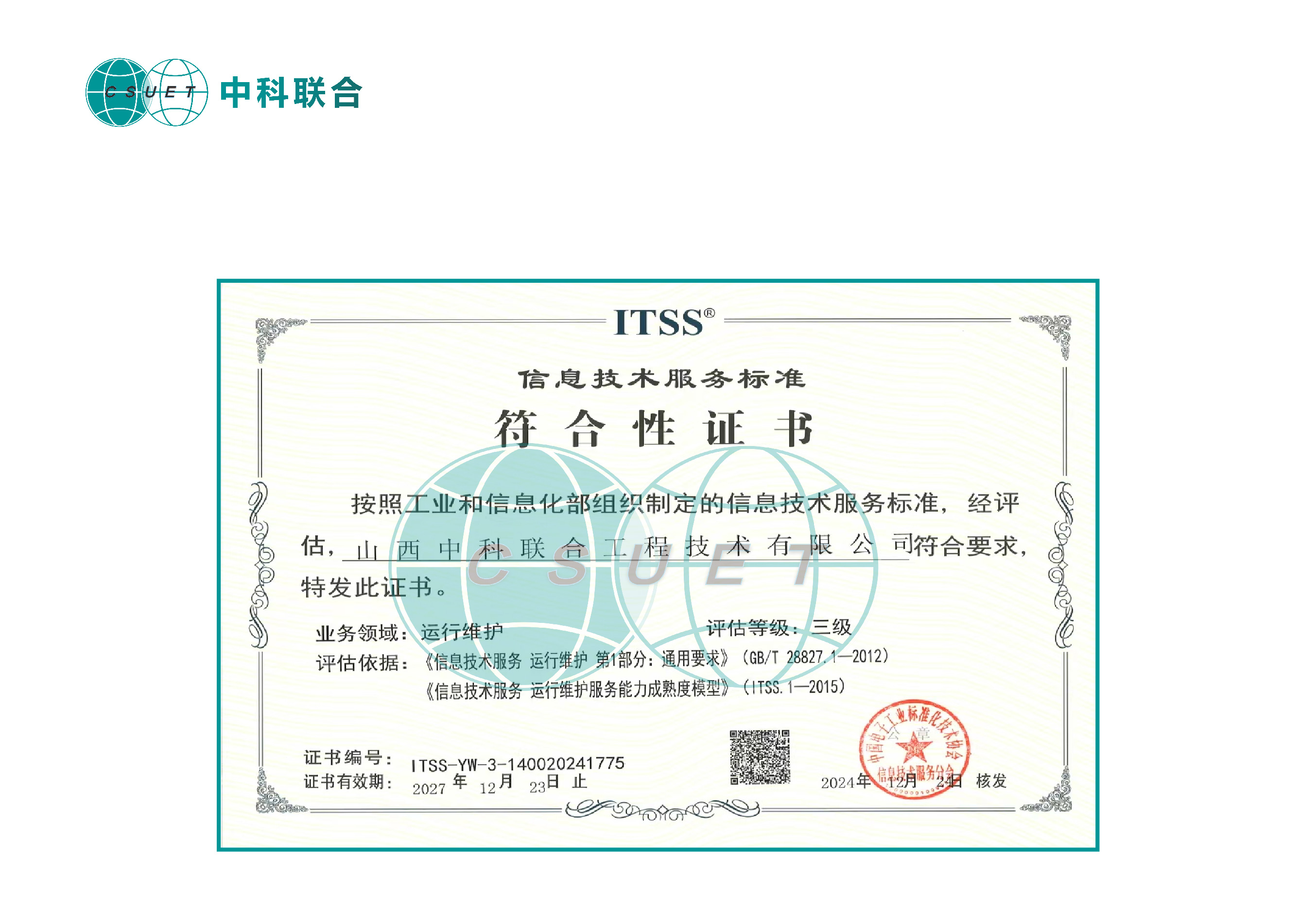 中科联合动态丨山西中科联合工程技术有限公司荣获ITSS信息技术服务标准符合性证书!