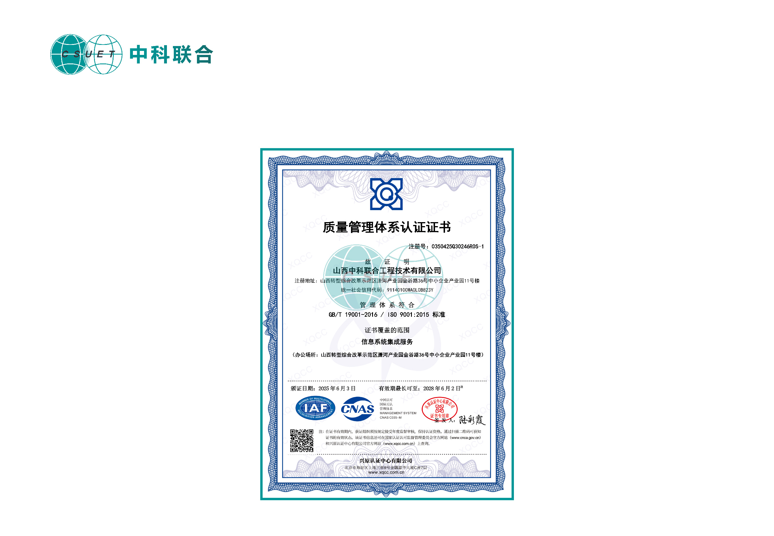 查看详情热烈祝贺山西中科联合工程技术有限公司,成功获得质量管理体系、环境管理体系、职业健康安全管理体系认证证书!这三张证书,是对公司在环境责任、员工安全保障、工程服务质量上的权威认可。从电子与智能化工程到信息系统集成,中科联合以标准化管理为基石,深耕技术、严控品质,用实力筑牢发展根基。 未来,公司将持续以体系为翼,在工程技术赛道上稳步前行,为客户交付更优质成果,为行业树立管理标杆!