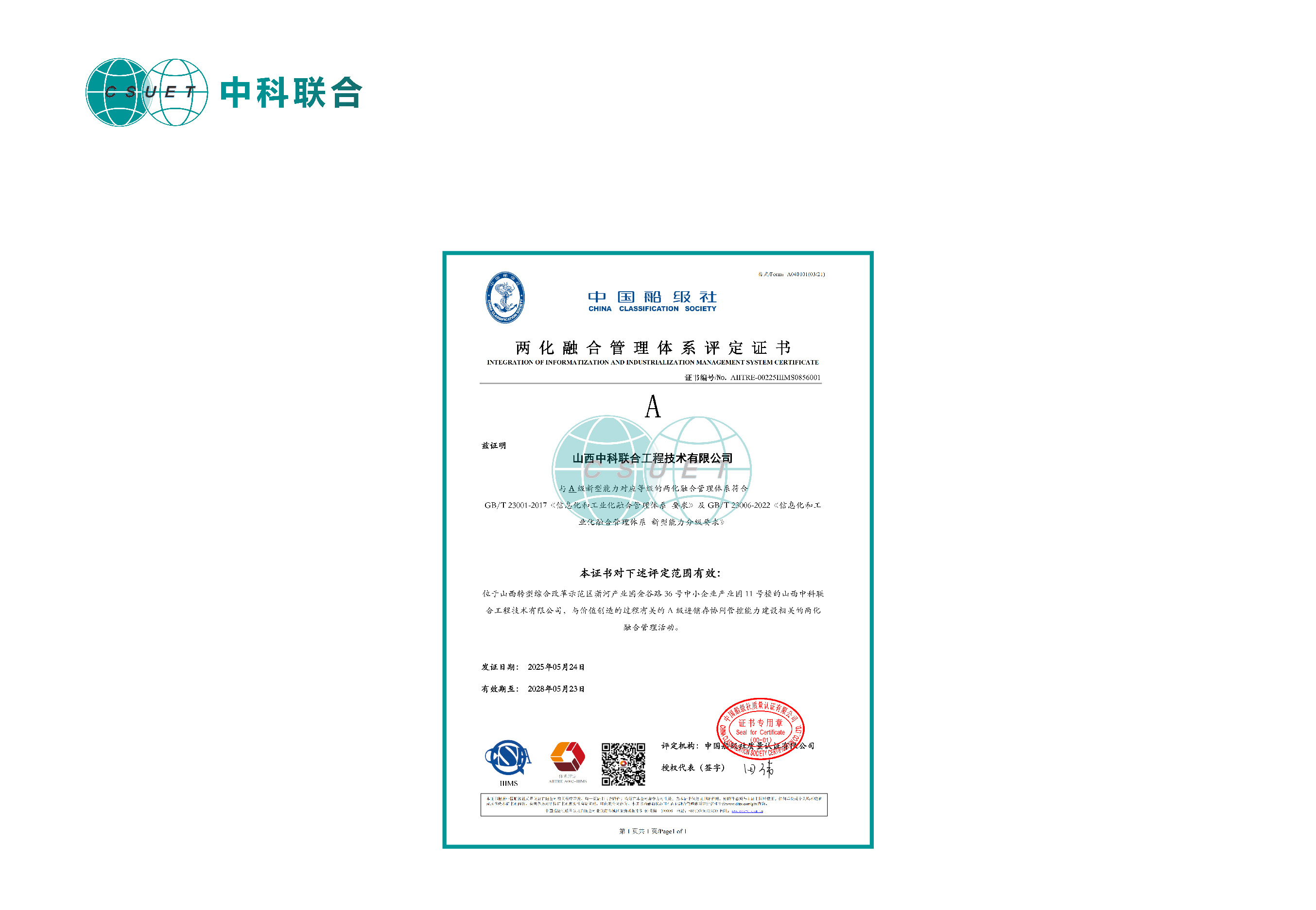 查看详情近日,山西中科联合工程技术有限公司传来重磅喜讯 —— 公司正式斩获中国船级社质量认证有限公司颁发的两化融合管理体系评定证书!认证含金量:中国船级社作为国内顶尖认证机构,其评审覆盖战略规划、过程实施、绩效评估等 12 大维度,要求企业不仅具备技术应用能力,更需构建可持续优化的管理体系。